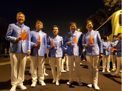 医学部侨联这5位教授参加了游行方阵,他们都是新归侨和侨眷的代表。老师们都把参加这次国庆70年群众游行看成一生难得的经历,是至高无上的荣耀。因此,尽管面临着年龄偏大、体能差,单位教学、科研、临床工作繁重等各种困难,但大家每天坚持体能训练,保时间、保质量,坚决不掉队、不拖方阵后腿,争取高水平地完成好任务。荣耀的背后是艰辛,国庆游行的演练和准备工作进行得也是异常辛苦。在70天的演练过程中,多少次,我们顶着夏末的骄阳,在演练场上反复整队、行进和呼喊口号,仿佛又回到了三十年前的学生时代。方阵一次次更改动作、调整道具、配合音乐。多少次,我们枕着秋夜的微凉,露宿在机场跑道、长安街头上,抬头是临晨三点深邃的星空中闪烁的北极星;朝阳冉冉升起时映红了一旁停放着战鹰的机翼;清晨天空鱼鳞状和阶梯状奇特的云彩像是对我们辛苦训练的褒奖;数百辆大巴绵延排列接送我们回集结地的壮观;中秋之夜我们在长安街沿线等候命令时和几万人一起席地而坐赏月畅谈的情景至今历历在目。无论身心多么疲惫,集结号就是命令;无论是二十、三十、还是六十岁的年纪,我们都精神饱满。因为大家知道,我们要去庆祝祖国的生日,要去见证复兴的荣光,这一切的付出都换来了我们在天安门广场上的辉煌。